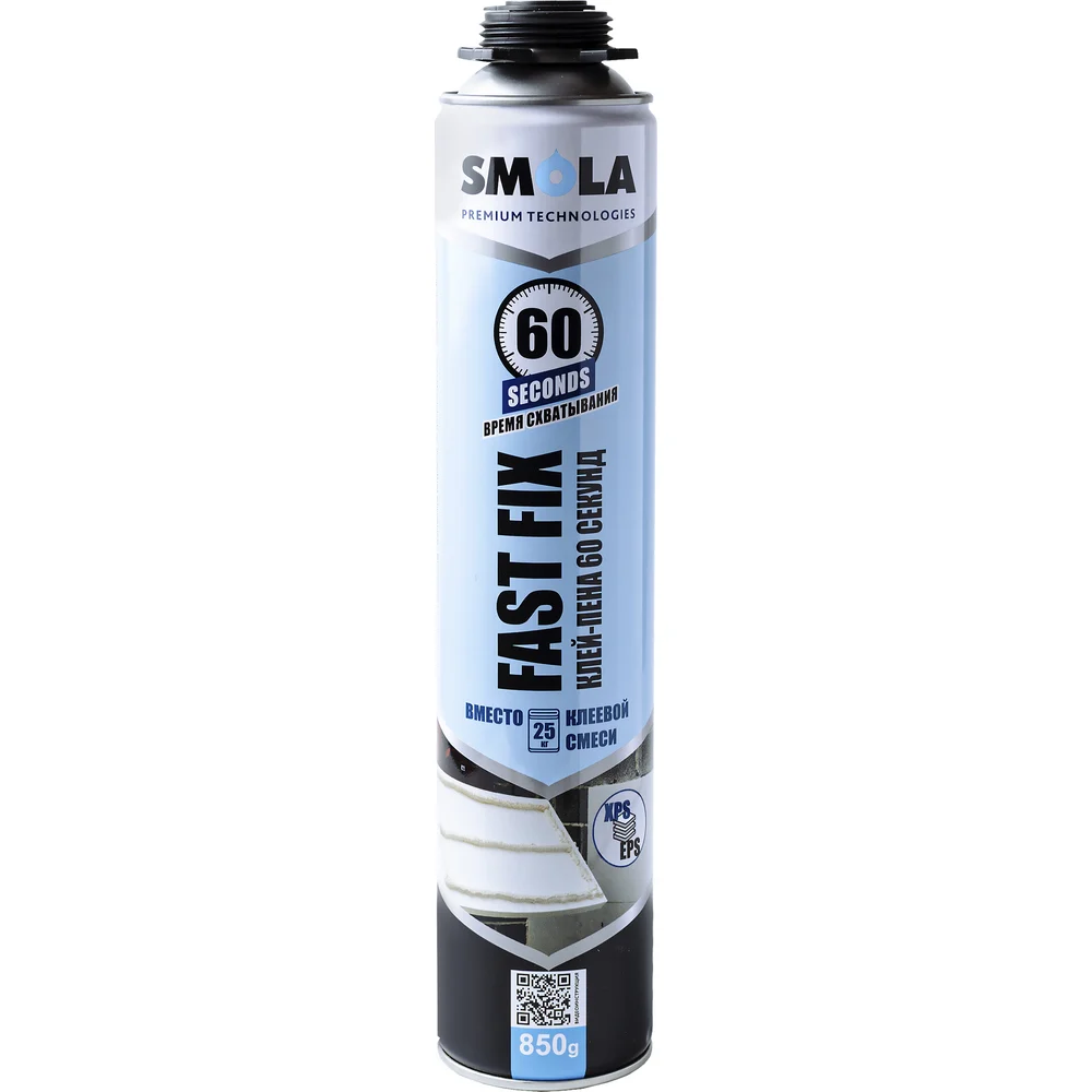 Клей-пена имеет очень низкое вторичное расширение, что исключает деформацию склеиваемых материалов, применяется как внутри, так и снаружи помещения. SMOLA FAST FIX отличается высокой первоначальной адгезией, первичным схватыванием за 1 минуту и полным приклеиванием за 5 минут, а также равномерным отверждением по всему нанесенному слою клея-пены.